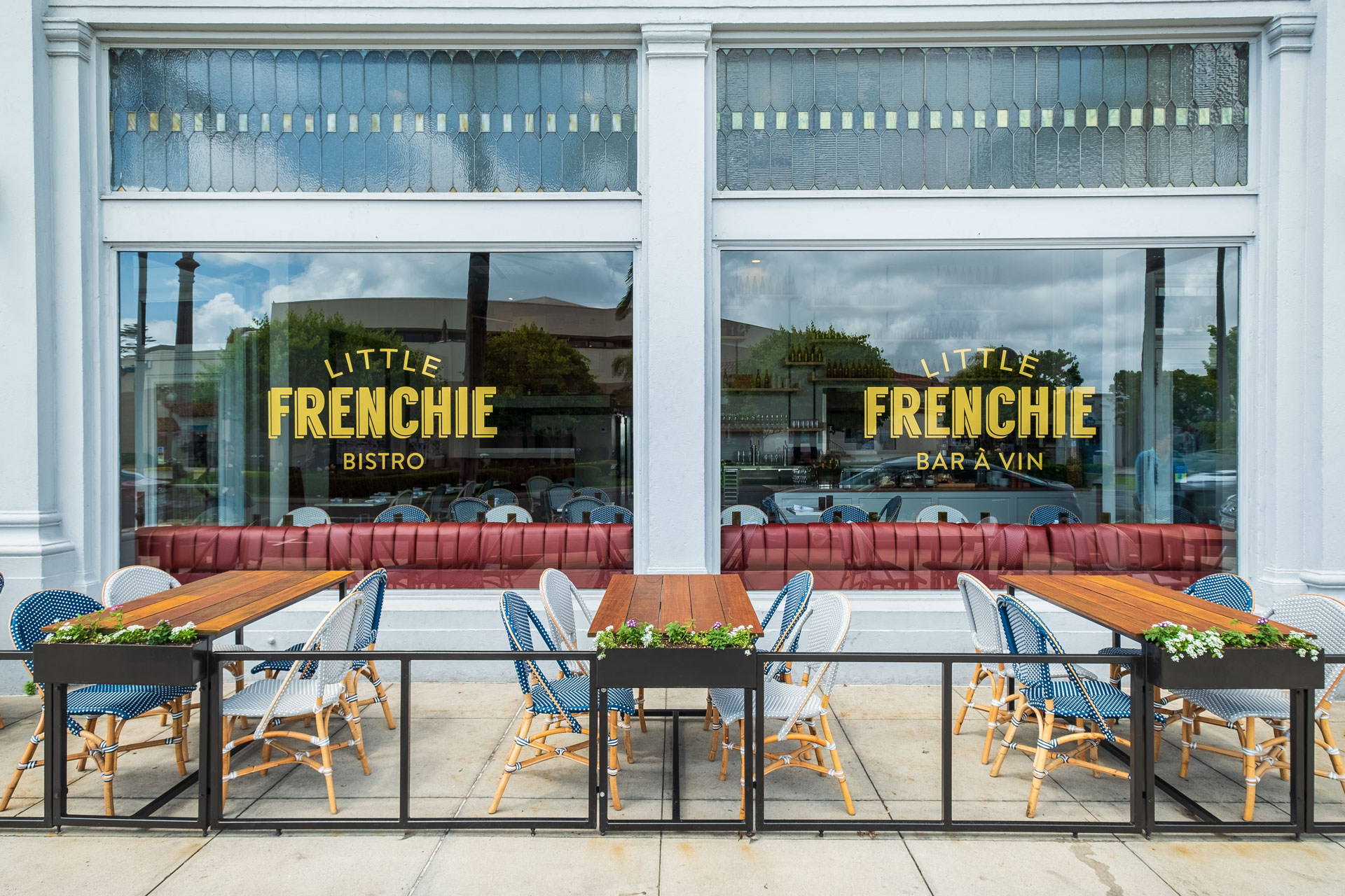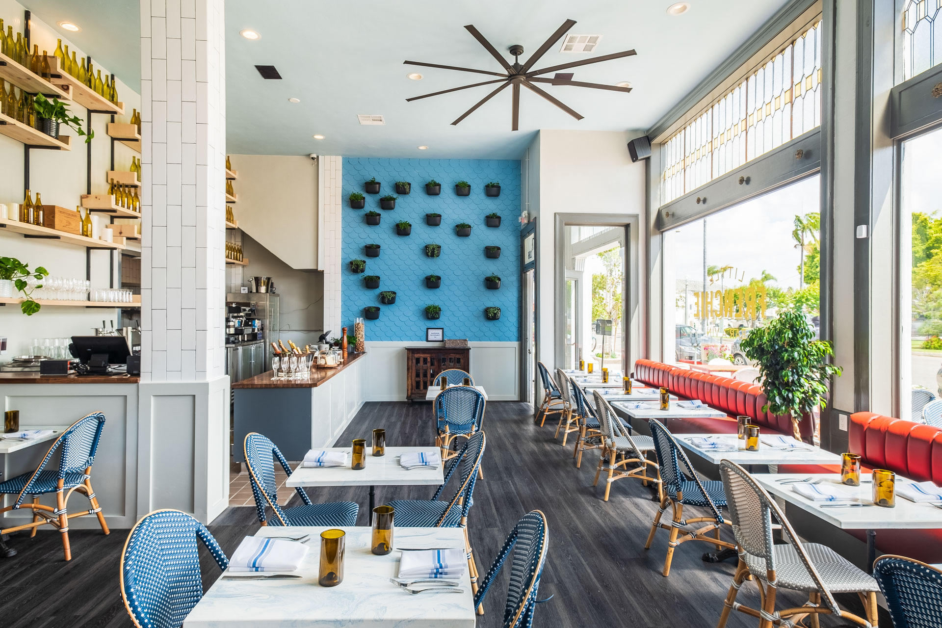 That authenticity mattered. Little Frenchie is situated in the historic Pacific Western Bank building, a 1911 Beaux-Arts structure with grand proportions and a sense of local heritage. The renovation transformed the 1,600-square-foot interior into a light and charming space, featuring cool blues and creams, deep red tufted banquettes, lush florals and foliage, and globe lights glinting over intimate marble tables. Large windows and muralled “street views” nod to the bistro culture of Paris while keeping the vibe relaxed and Californian. Outside, the same story continues onto a shaded street-side patio where the Sofie chairs and bistro tables set the scene for breakfast croissants, long rosé lunches, and lively evening dinners.